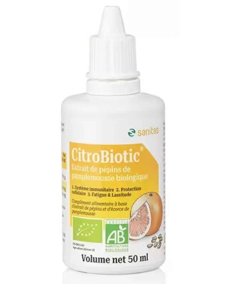 Citrobiotic - Extrait de pépins de Pamplemousse bio 50 ml permet de stimuler les défenses naturelles normales en apportant des bioflavonoides naturels et de la vitamine C naturelle.